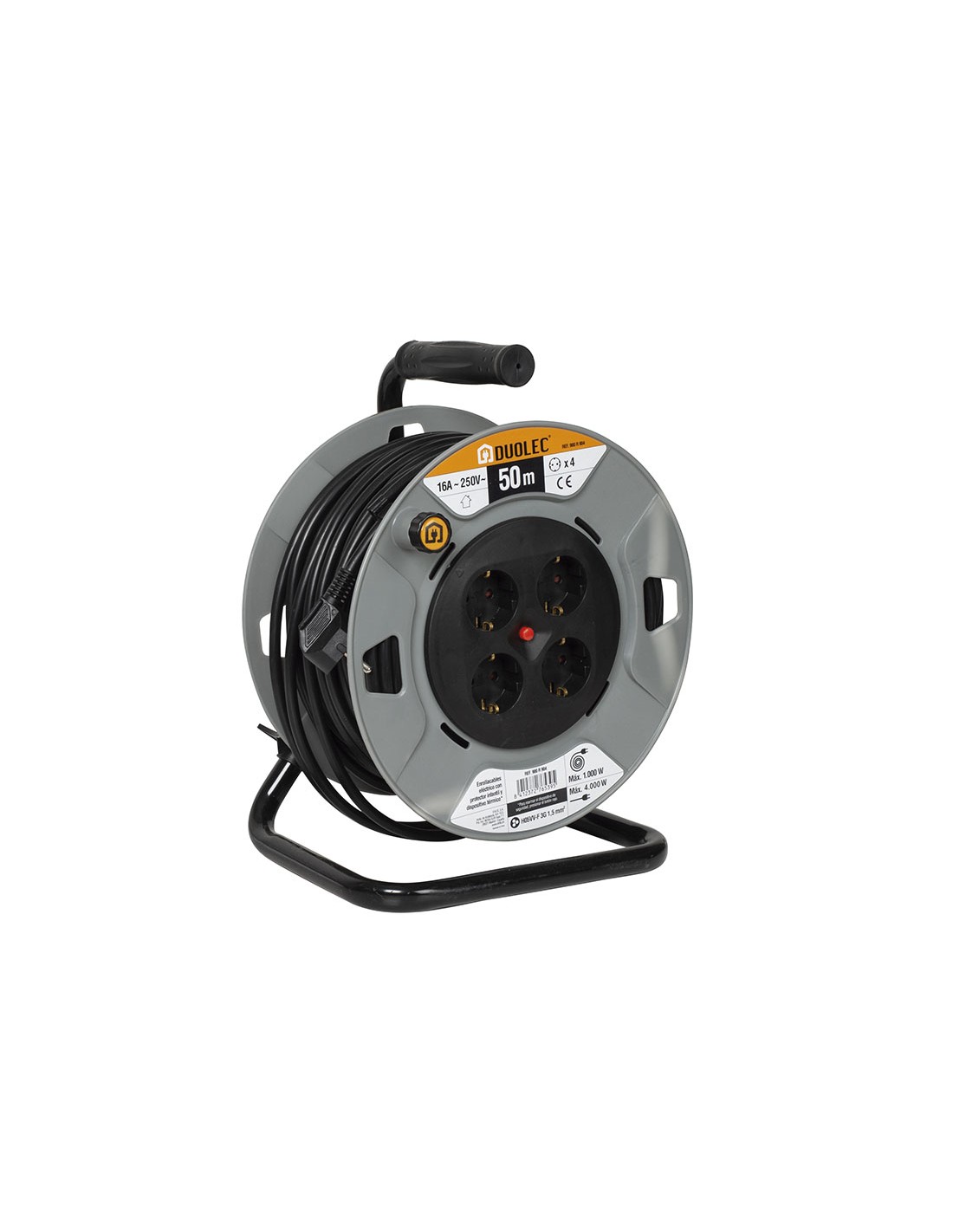 4 tomas T/T lateral. Cable H05VV-F 3G1.5. Interruptor de proteccion térmica. Potencia máxima admisible cable desenrollado 4.000 W. Cable enrollado 1.000 W. Tensión 16A/250V. Protección infantil. Tirador extensible. Placa para fijar el carrete durante el transporte. IP20.